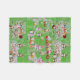 This design artwork for the New Year season is a lively and whimsical illustration filled with vibrant colors and festive characters. Dominated by a bright green background, the scene is bustling with playful figures, including multiple cheerful Santa Clauses, adorable elves, and charming penguins.