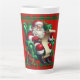 Eine rote und grüne Tasse für Weihnachten in einem Karierten und Santa in der Leitung Überprüfung seiner Liste