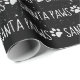 Weißer SANTA PAWS Text mit Schneeflocken, Haustier-Pfoten Sterne, auf schwarzem Hintergrund.