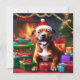 Dieses Bild unterstreicht den Urlaubssinn mit dem Staffy in einer Weihnachtsmannmütze, umgeben von Geschenken und Weihnachtsdekorationen, bereit, etwas "paw-some" Beifall zu verbreiten.