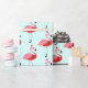 Neuartiges Weihnachtspapier mit einem Muster aus rosa Flamingos in Santa Outfits auf blauem Hintergrund.