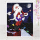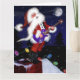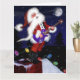 Der Weihnachtsmann spielt Gitarre in einem Schneesturm auf dem Dach, der an die Weihnachtsbeleuchtung angeschlossen ist. Happy Holidays, Frohe Weihnachten, Weihnachtsmann