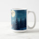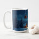 Der Schlitten des Weihnachtsmanns steigt über einen Vollmond, angeführt von Rentieren, die durch den Sternenhimmel galoppieren. Unten leuchten die bunten Lichter der Stadt auf dem schneebedeckten Boden.