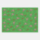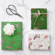 Dieses Set der Packung Papierblätter haben ein wiederholtes Bild von Weihnachtsmann, der einen roten Zug mit Pfefferminzkerzenrädern fährt, frohen Weihnachtstext in Rot und glänzende goldene Sterne. Die drei Hintergründe sind grün mit Goldflecken, dunkelgrün mit leuchtenden Sternen und weiß mit roten Polka-Punkten.