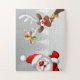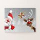 Niedliches Cartoon-Bild und Santa und sein Rentier Rudolph in einer schneebedeckten Winterlandschaft. Das angezeigte Rätsel ist mit großen Teilen für Kinder konzipiert, kann aber bei einem Karo nach draußen für eine andere Größe oder Schwierigkeit umgeschaltet werden.