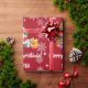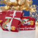 Modern, cute, festive custom-made Christmas gift wrap for kids, with Santa, a Christmas tree, lots of presents, the greeting "Merry Christmas" in stylish typography, and a personalized name. On a Xmas red background, with snowflakes.