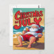 Ein fröhlicher Weihnachtsmann entspannt sich auf einem Sessel am Sandstrand und genießt die warme Sonne und die Meeresbrise.