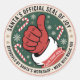 Verbreiten Sie Weihnachtsstimmung mit diesem Sticker mit Santas offizieller Freude-Siegel. Der als runder Stempel entworfene Sticker zeigt Santas Handschuh-Hand, die einen freudigen Daumen hoch hält, umgeben von Zuckerstangen und Schneeflocken für eine festliche Note.