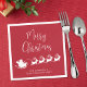 Vergnügen saisonale Rot-Weiß-Servietten für Ihre Weihnachtsfeiern und Tischdekoration mit einer Silhouette von Rentieren, die den Schlitten des Weihnachtsmanns durch Luft fliegen, "Frohe Weihnachten" in einem modernen Drehbuch und Ihren Namen oder Event in einfacher Typografie.