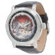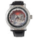 This charming watch face presents a cozy winter scene. Santa Claus stands nestled among heavily snow-laden pine trees, ready to deliver gifts. The rich red background contrasts beautifully with the pristine white snow, creating a festive, cave-like ambiance. It's a delightful and artistic timepiece, perfect as a decorative holiday accent, capturing the vivid magic of Christmas spirit.