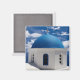 Magnet mit Santorini, Griechenland Foto mit blauem Himmel und weißen Wolken.