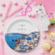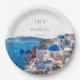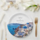 Diese eleganten Aquarellfarben Santorini Griechenland Hochzeitspapier-Teller können mit Ihren Informationen in der modernen Typografie personalisiert werden. Entwickelt von Thisisnotme©