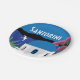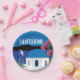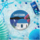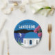 Santorini, Griechenland, eine farbenfrohe Illustration in einem antiken Reisestil vereint diese wunderschöne griechische Insel mit einem klassischen blauen Kuppel und weißem Gebäude, einer blühenden Bougainvillea, einem Kaktus und einem Blick auf das Meer mit Bergen. Der Name Santorini steht ganz oben in einem Vintagen Deko Schriftart. Helle Farben erinnern an einen hellen und schönen Ort.