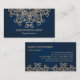 Eine schönes Juwel getonte Marine- und Goldgeschäftskarte des Saphirs blaue mit einem exotischen indischen inspirierten dekorativen Sari wie Muster mit einem Lotos und einem Blumensonnendurchbruch entwerfen. Diese elegante und schöne moderne nennende Karte der upscale und luxe indischen Art ist für einen Yogalehrer, Massagetherapeuten oder jedes mögliches andere Heilen des beruflichen Körpers perfekt, des Verstandes und des Geistes. Grafik entworfen, Copyright und von Chrissy H. Studios, LLC geschaffen. Alle Rechte vorbehalten.