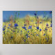 In einem goldenen Grasfeld blühen lebendige blaue Zichorie und Maisblumen unter einem blass blauen Himmel. Der blonde und grüne Hintergrund wird auch durch das glitzernde Rosa der Blume des Rasens unterbrochen.