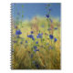 In einem goldenen Grasfeld blühen lebendige blaue Zichorie und Maisblumen unter einem blass blauen Himmel. Der blonde und grüne Hintergrund wird auch durch das glitzernde Rosa der Blume des Rasens unterbrochen.