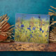 In einem goldenen Grasfeld blühen lebendige blaue Zichorie und Maisblumen unter einem blass blauen Himmel. Der blonde und grüne Hintergrund wird auch durch das glitzernde Rosa der Blume des Rasens unterbrochen.