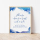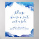 Individuell bedrucktes Hochzeitszeichen mit abstraktem blauen Wasserfarbenrand, um sich mit unserer Sapphire Tide Kollektion abzustimmen. Der Text lautet "Wählen Sie einen Platz, nicht eine Seite. Wir sind alle Familie, wenn der Knoten gefesselt ist!" Benutzen Sie die Designtools, um den Wortlaut, die Schriftart und die Farben zu bearbeiten, oder laden Sie Ihre eigenen Fotos hoch, um ein einzigartiges Hochzeitszeichen zu schaffen.