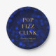 Elegante Teller aus Papier mit den Worten "Pop Fizz Clink" in Imitaten goldene Folie vor einem saphir blauen Bugglampen Muster Hintergrund. Ideal für Verlobungsfeiern, Hochzeiten, Jubiläen oder andere Veranstaltungen. Personalisieren Sie es, indem Sie den Platzhalter-Text durch Ihre eigenen Informationen ersetzen. Für weitere Optionen, wie zum Beispiel den Schriftart zu ändern und ihn zu vergrößern oder zu verändern, klicken Sie auf den Button "Anpassen". *Bitte beachten Sie, dass das Zazzle-Wasserzeichen, das in der Zoomvorschau angezeigt wird, NICHT auf dem gedruckten Endprodukt erscheint. © Rosewood and Citrus