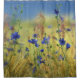 In einem goldenen Grasfeld blühen lebendige blaue Zichorie und Maisblumen unter einem blass blauen Himmel. Der blonde und grüne Hintergrund wird auch durch das glitzernde Rosa der Blume des Rasens unterbrochen.