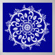 Diese weiße Mandala sitzt auf einem hellen, tiefblauen Hintergrund. Die Farben sind intelligent und introspektiv. Teil der Payon Mandala Kollektion.