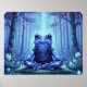 This whimsical poster features a crystal frog meditates in a glowing, enchanted forest - geometric blue amphibian in lotus pose, serene zen vibes, fantasy art, magical nature scene.