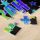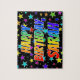 This lively, exciting, birthday-themed jigsaw puzzle design feature the message "HAPPY BIRTHDAY, SARAH" with the characters having a colorful rainbow spectrum inspiriert gradient pattern, along with a fun star shapes background pattern. An exciting puzzle like this might be used to send birthday wishes to somebody named Sarah. [~ Z0000468]