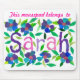 Ein hochwertiges Mousepad mit handgemaltetem Papier-Collage-Design von Blume und Blätter und dem Namen "Sarah", sodass der Text lautet: "Dieses Mousepad gehört Sarah". Siehe auch passende Grußkarte, Geschenke und Kleidung.