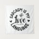 A playful and humorous circular typography design featuring the phrase, "Sarcasm Is My Love Language." The word "Love" is in a central, flowing script with small decorative hearts and a leaf motif, while the surrounding text is in a clear, bold, all-caps font. This design is perfect for those who express affection and humor through sarcasm.