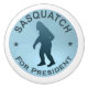 Eine dunkle Silhouette von Sasquatch (Bigfoot) auf einem mittelblauen Hintergrund, zusammen mit Blocktext, der "SASQUATCH FOR PRESIDENT" liest. Nicht gerade begeistert von der diesjährigen Präsidentschaftswahl? Suchen Sie einen Außenseiter aus Washington? Hier ist dein Kandidat. Tatsächlich verbringt Bigfoot fast seine ganze Zeit draußen in Washington, Idaho, Oregon, mehreren anderen Staaten und Teilen Kanadas. Groß genug, um alle möglichen Stellungen zu füllen, aber keine Angst, dass er den Kongress dazu bringen wird, eine radikale Agenda durchzusetzen, links oder richtig, wie er so selten gesehen wird. Verfasst von der Politischen Aktion in Kryptozoologie (CPAC); Bonners Ferry, ID