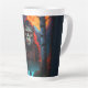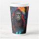 Sasquatch Moonlit Jagd Latte Tasse. Ein majestätischer Sasquatch unter einem leuchtenden orangefarbenen Mond. Set inmitten eines bezaubernden Waldes, mit schimmernden, blauen Wasserfällen im Vordergrund, verbindet dieses Design unheimliches Geheimnis mit natürlicher Schönheit. Der durchdringende Blick und das fließende Fell der Kreatur werden durch das Licht des Mondes erhellt, was das Wesen der ungezähmten Wildnis einnimmt.