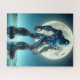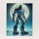 Sasquatch steht unter einem Vollmond umgeben von Bergen und zeigt ein Titan-Exoskelett elektronischer Schaltungen und LED-Lampen...