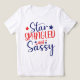 Ein lebendiges und patriotisches Design mit dem Satz "Star Spangled and Sassy" in fett gedrucktem, dynamischem Text. Die Wörter "Star" und "Sassy" glänzen blau, während "Spangled" und "und" Pop in Rot, wodurch ein auffallender Kontrast entsteht. Gespeicherte rote und blaue Sterne verstärken das festliche, spirituelle Ambiente und machen dieses Design perfekt für Feiern, Kleidung oder alle, die ihren lustigen, selbstbewussten Patriotismus zeigen wollen.