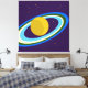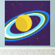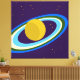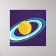 Der Saturn kehrte zurück. Genießen Sie die skurrile Out-of-the-world Sci-Fi-Vibe dieses elementaren grafischen zeichnend, das super lustig zu kreieren war. Zunächst eine dramatische Leinwand des lila Weltraums. Zweitens, ein vollkommen runder Senf-gelber Planet. Dann, farbenfrohe Aqua, leuchtend blau, grün und weiß, kreisende Ringe. Niedliche Sterne im Hintergrund. Dann, eine Touch von Launen mit einem kleinen Schießstar in der Ferne. Zurück zur Planetenoberfläche mit Touchs eines lustigen, zusätzlichen Schattens.