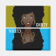 Dieses Design zeigt eine Frau auf der schmutzigen Seite mit einer Schüssel, auf der sauberen Seite ein angenehmes Lächeln. Sie hat eine volle alte und rote Lippe.