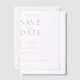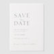 Diese Hochzeit speichern Sie das Datum Einladung verfügt über ein sauberes und elegantes minimalistisches Design. Die Vorderseite zeigt eine moderne Mischung aus Serif- und Script-Schriftart auf einem Vellum-Papier mit weißem Hintergrund.
