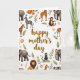 Diese Karte zeigt die Worte „Happy Mother’s Day“ zentriert in einem fließenden, gebräunten Goldstil, der sich klar von einem weißen Hintergrund abhebt. Um die Nachricht herum bildet ein Ring aus Safari-Tieren einen gemütlichen Rahmen, wobei sanfte Elefanten, ruhige großkatzen mit Mähnen und hohe gefleckte Giraffen sich nach innen neigen, als ob sie einen stillen Moment miteinander teilen ❤️. Gestreifte Zebras und kleine Affen bringen Bewegung hinein, einige sitzen auf blättrigen Ästen, als ob sie das Grußwort bewachen. Zwischen den Tieren schaffen weiche rosa Blumen mit sonnengelben Zentren und Zweige mit hellorangenen Blüten eine gartenähnliche Umrandung, die sich pflegend und nah anfühlt. Die Grüntöne reichen von frischen Blattfarben bis hin zu tieferen Schattierungen und helfen dabei, dass die warmen Tierfarben erdverbunden und natürlich wirken. Der Hauptext bleibt in der Mitte, während die Illustrationen größtenteils entlang der Ränder bleiben und offenen Raum lassen, damit das Design