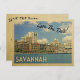 Vintage Savannah Save the Date Postkarten mit einer City Skyline Ansicht. Dieses coole Retro-Design aus der Mitte des Jahrhunderts ist der perfekte Weg, um Gäste zu Ihrer Savannah Georgia Hochzeit in Urlaubsort zu sammeln.