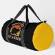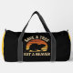 This witty black and light orange duffle bag features a beaver silhouette in front of a retro sunset, along with the humorous and controversial phrase "SAVE A TREE EAT A BEAVER." It's a bold statement piece for those with a unique sense of humor and appreciation for wordplay. Perfect for gym, travel, or just to spark a conversation. Edit color of the bag caps and body in the Design tool to your favored colors.