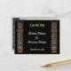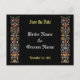 Eine benutzerdefinierte, Save the Date Postkarte mit einer wunderschönen, gotisch illuminierten Manuskriptkunst aus Blume und Blätter auf schwarzem Hintergrund, sowie bearbeitbarer Text in schwarzen Schriftart.
