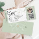 Destination Beach Wedding Boarding Pass Ticket Gold Flugzeug Save the Date mit Herz und Flugzeug Ikone mit einfachen minimalistischen Linien Kunst-Weltkarte und sage grün Hintergrund Farbe. QR-Code hinzufügen