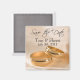Speichern Sie die Date Magnete, Script mit goldenen Hochzeitsbands klingelt Design. Hübsches und elegantes Design mit extravagantem Schriftzeichen und Ihren personalisierten Details. Ideal für eine Hochzeitsfeier mit dem Thema Gold und Weiß.
