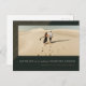 Dieses schicke Save the Date mit einem geätzten gestreiften Rahmen auf dem oberen links, der einen Single großen horizontalen Foto mit einfacher und moderner Typografie mit den Namen der Ehepaare unterstreicht. Der dunkelwaldgrüne Hintergrund hebt sich von der Masse ab und schafft ein elegantes und raffiniertes Aussehen. Die Rückseite ist als Postkarte für einfaches Mailen Set.