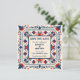 Boho chic Save the Date Karte, florale geometrische, boho volkskunstliche Art Stil, rot, weiß und blau. Enthält QR-Codebereich (kann gelöscht werden, um Muster zu zeigen) und anpassbare Felder für Namen, Datum, Position und Kontaktinformationen.