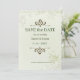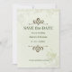 Streng geschrieben, diese Save the Date Karte hat eine formale Touch. Set auf einem minzgrünen Hintergrund mit abgeschirmtem Blumendruck. Der Serif-Text wird zusammen mit einem Zierschnitt gehalten.