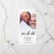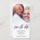 Save the Date Fotokarte personalisiert mit Ihrem eigenen romantischen Foto. Save the Date in einem wunderschönen schwarzen Skript über Ihrem Hochzeitstag geschrieben und zusätzliche Informationen für Ihre zukünftigen Hochzeitsgäste. Der Rand zwischen Foto und Text der Hochzeit wird durch einen weißen Farbverlauf gemildert. Gib auch deine Namen!