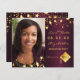 Ein Foto Save the Date für eine Abschlussfeier 2022. vorne: Fügen Sie Ihr eigenes Foto in vertikaler Größe des Absolventen hinzu. Eine bordeauxrote Hintergrundfarbe, die mit goldenen Imitaten geschmückt ist. Personalisieren und fügen Sie einen Namen und ein Datum hinzu. Goldene Buchstaben. Der Name und der Text: Save the Date sind mit einem modernen handgeschriebenen Stilskript geschrieben.