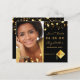 Ein Foto Save the Date für eine Abschlussfeier. vorne: Fügen Sie Ihr eigenes Foto in vertikaler Größe des Absolventen hinzu. Eine schicke schwarze Hintergrundfarbe, die mit goldenen Imitaten geschmückt ist. Personalisieren und fügen Sie einen Namen und ein Datum hinzu. Goldene Buchstaben. Der Name und der Text: Save the Date sind mit einem modernen handgeschriebenen Stilskript geschrieben.