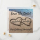 "Save the Date!" ist in stylishem Text, oder leicht ändern die Formulierung, wird auf diesem wunderschönen, originellen beruflichen Foto von zwei Herzen geschrieben in den Sand entlang des blauen Ozeanwassers, um Liebe und Romantik. Fügen Sie einfach den Namen der Braut und des Bräutigams in jedes Herz ein, wie gezeigt, und das Datum darunter. Legen Sie Ihren eigenen Text, Ihre Details und Informationen auf die Rückseite dieser beliebten Einladung. Ein tolles Konzept für kommende Verlobungen, Hochzeiten am Strand, Jubiläen und Save the Date lädt das glückliche Paar ein und gibt Ankündigungen.