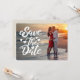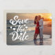 Postkartenankündigung Ihres Hochzeitdatums. Benutzen Sie das ganze horizontale Bild mit "Save the Date" überlagert auf dem Foto. Optionaler dunkler Farbverlauf für weiße Skripte, um sich zu unterscheiden, wenn der Hintergrund zu hell ist. Entfernen Sie den Farbverlauf, wenn Sie ihn nicht benötigen. Die Hintergrundfarbe ist anpassbar.